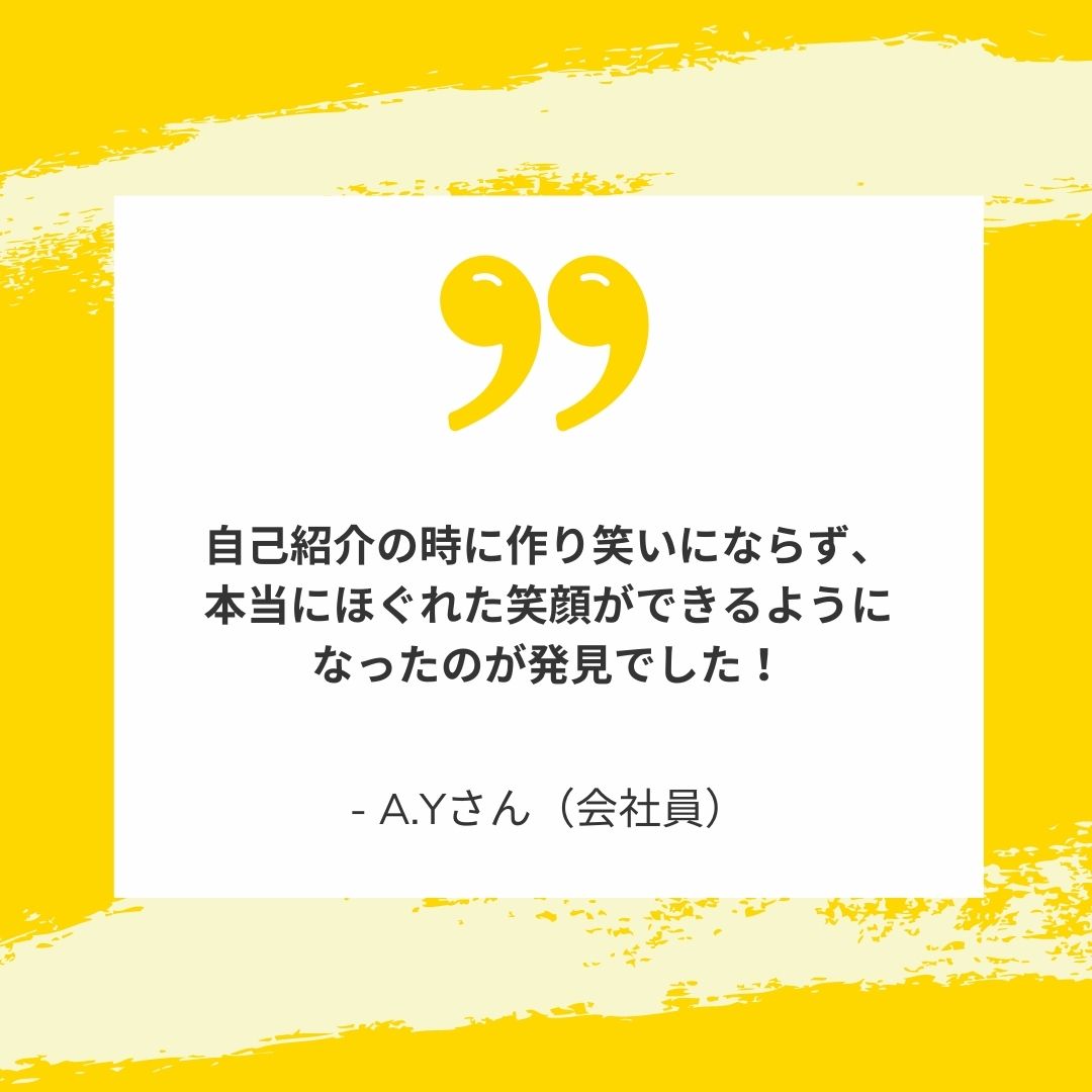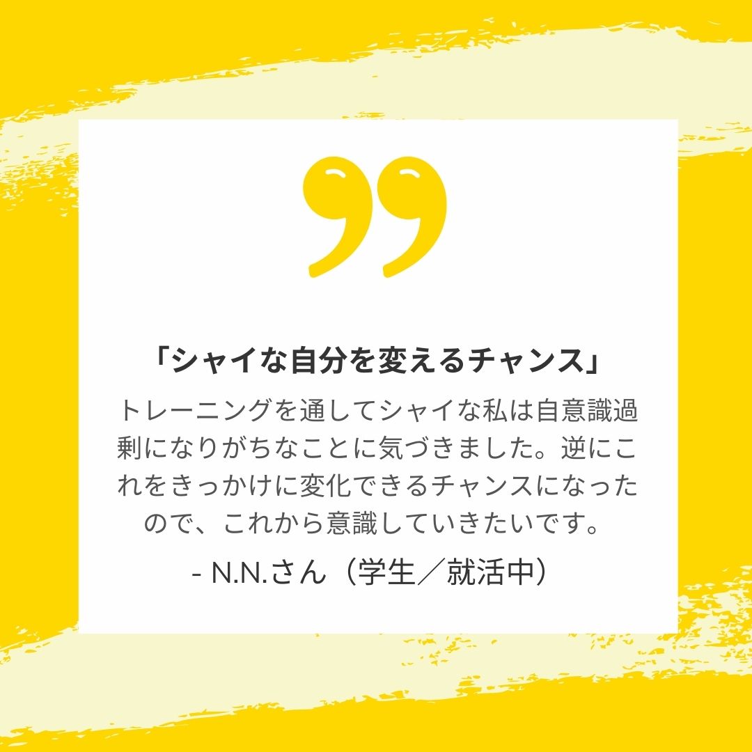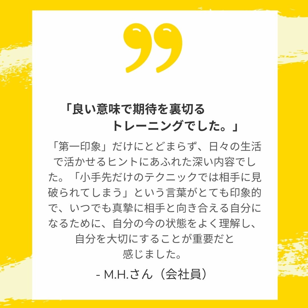【第一印象を科学する】というくらい体系的な内容で、面接など限られた時間の中でも一瞬で個性を表現するためのテクニックを学べました。相手に「会う前」にしておくべき大切な準備や心構えを凝縮して学べる機会はあまりなく、とても貴重なトレーニングでした。
