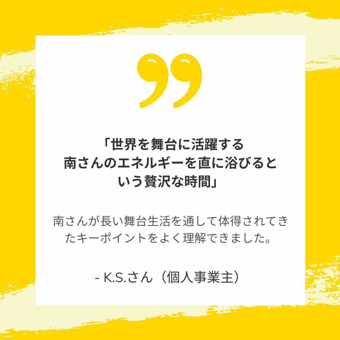 「自己紹介だけではなく、オンラインプレゼンスを高めオーディエンスと信頼関係を築いていく方法まで学べました!実際に体を動かすエクササイズがとても分かりやすくて衝撃でした!今は誰かと話すときにも意識しています。」