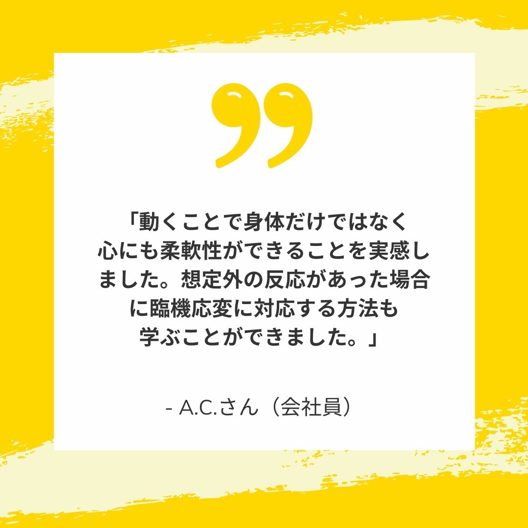 相手との接し方のコツ は今まで考えたことがないアプローチで感銘を受けました。体を動かすことで、心がどんどん開放されて楽しく前向きな気持ちになりました。具体的な方法を学べた充実した3日間をありがとうございました。